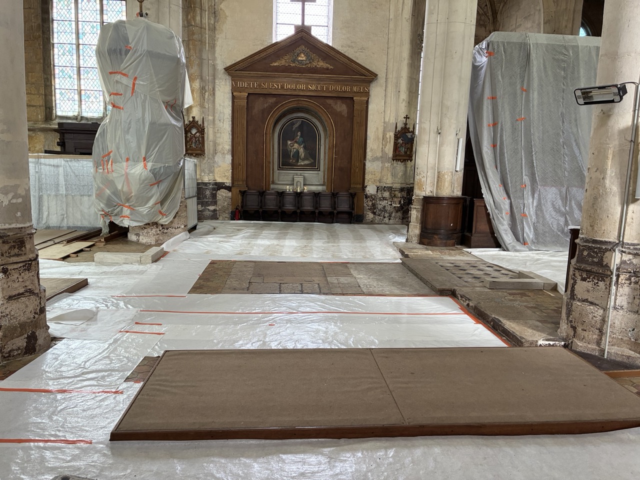 » Afin d’homogénéiser le chœur, une pose de dalle de pierre sera réalisée en remplacement des tomettes comportant de nombreuses fractures et ragréages entre l’emmarchement du chœur et le dallage à cabochons. »