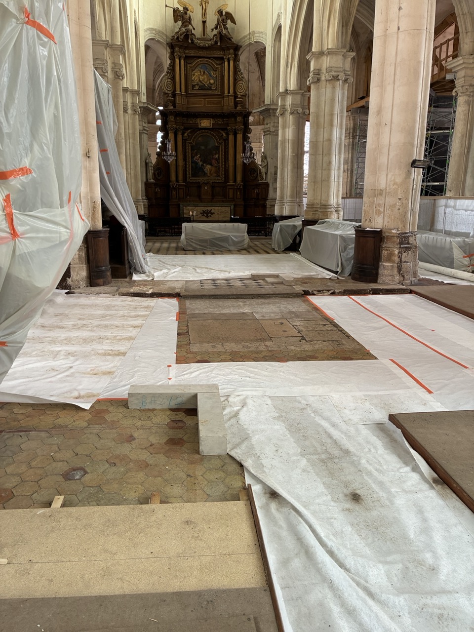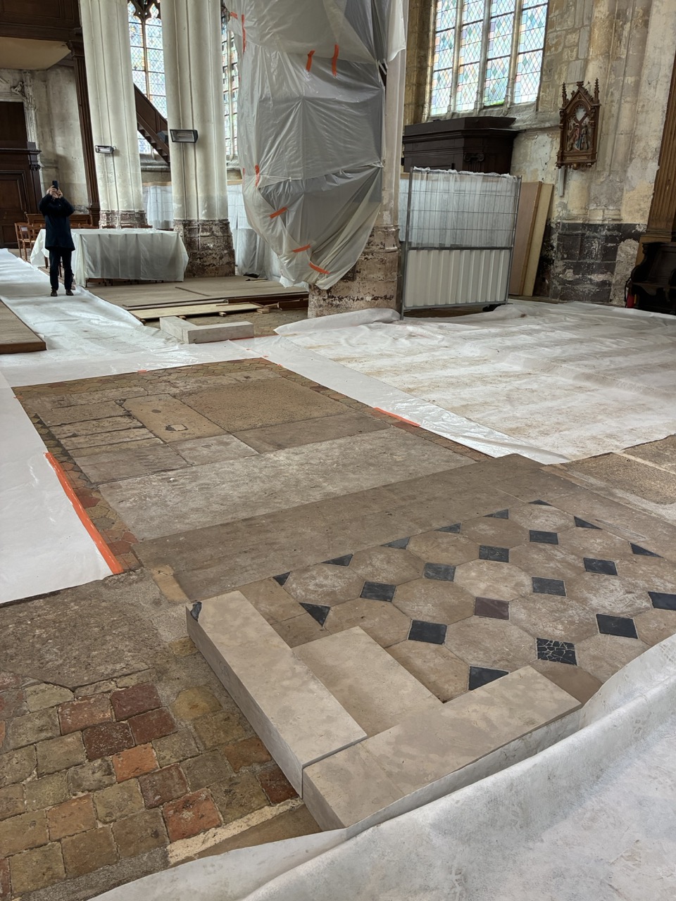 » Le chœur de l’église de Houdan présente de nombreux revêtements de sol, fruit des modifications successives de cet espace (emmarchements et dalles de pierre, tomettes carrées ou hexagonales et dallage à cabochons).