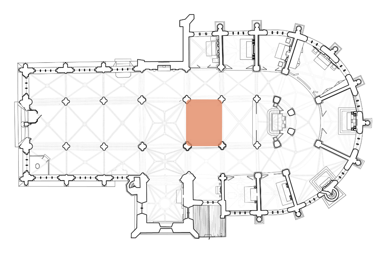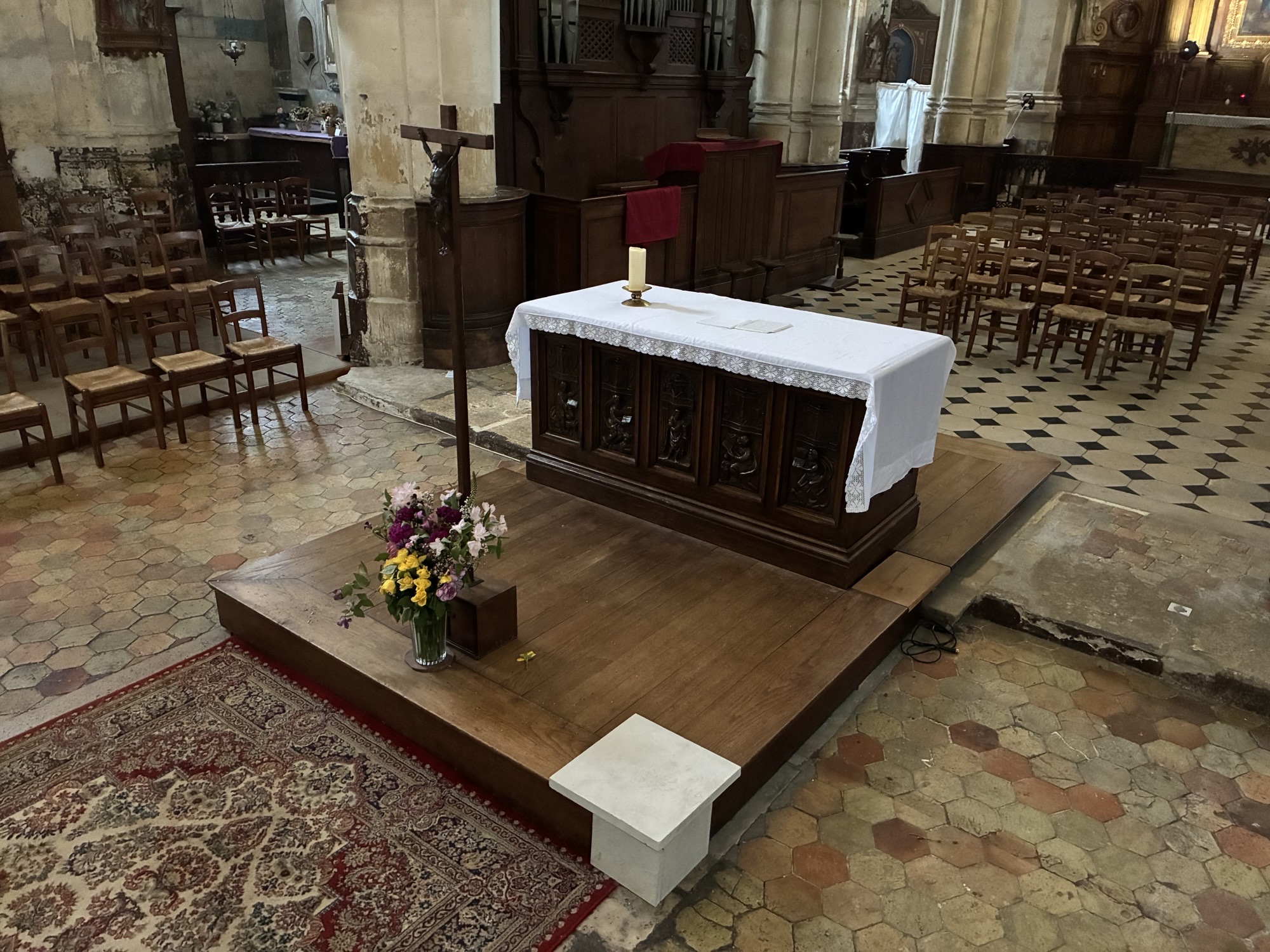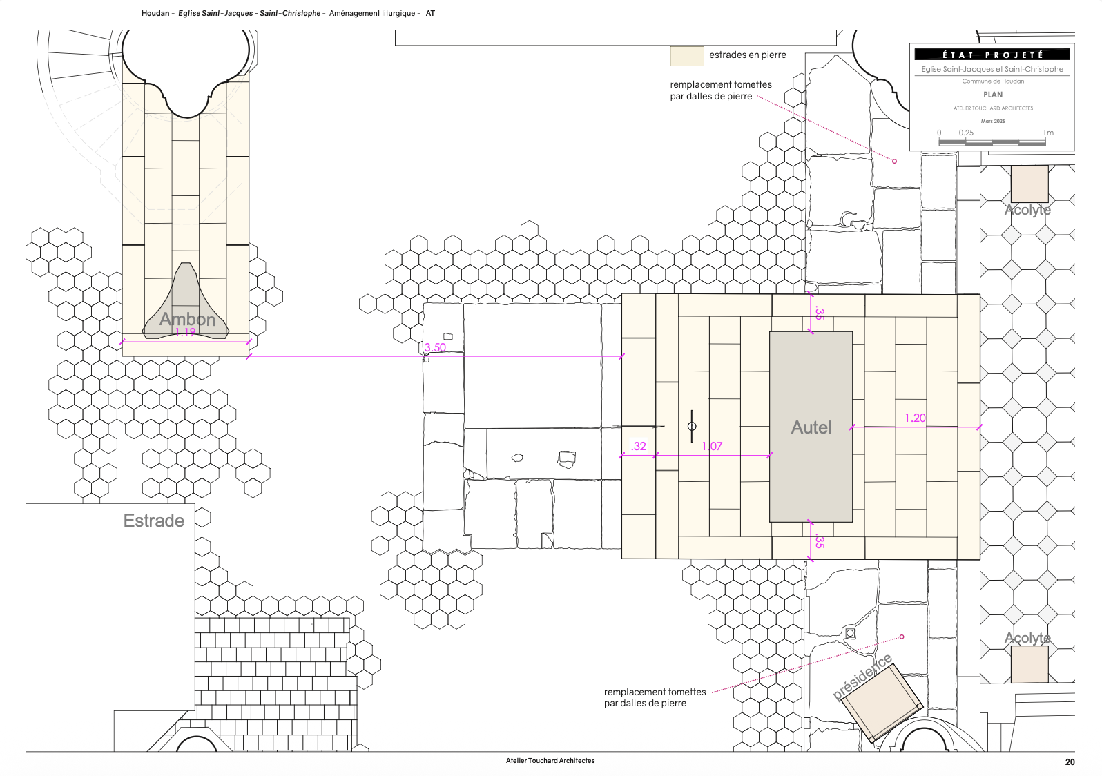 » Le projet d’aménagement liturgique prévoit la réalisation d’ estrades en pierre pour accueillir l’autel et l’ambon en remplacement d’estrades bois provisoires. L’autel et l’ambon existant sont conservés.